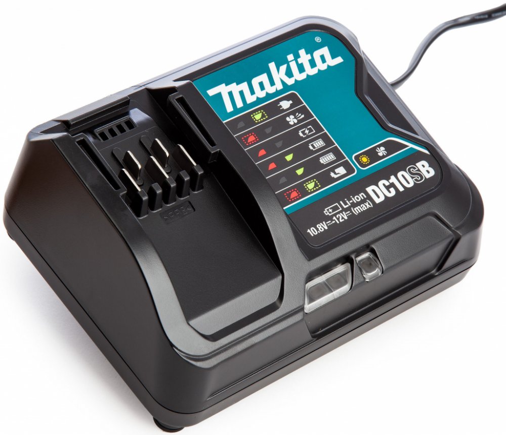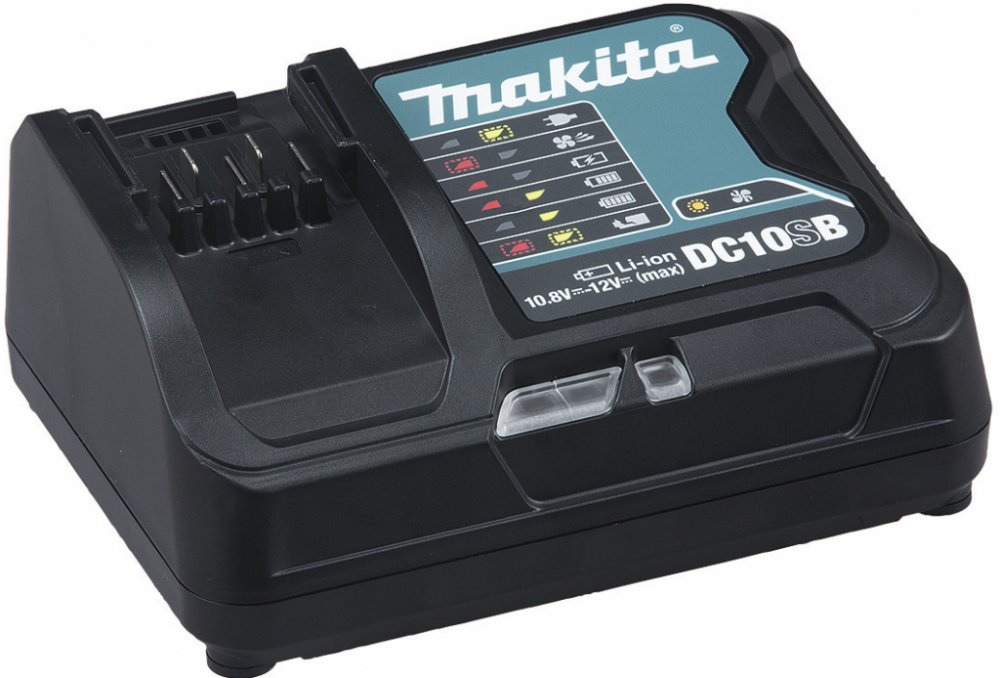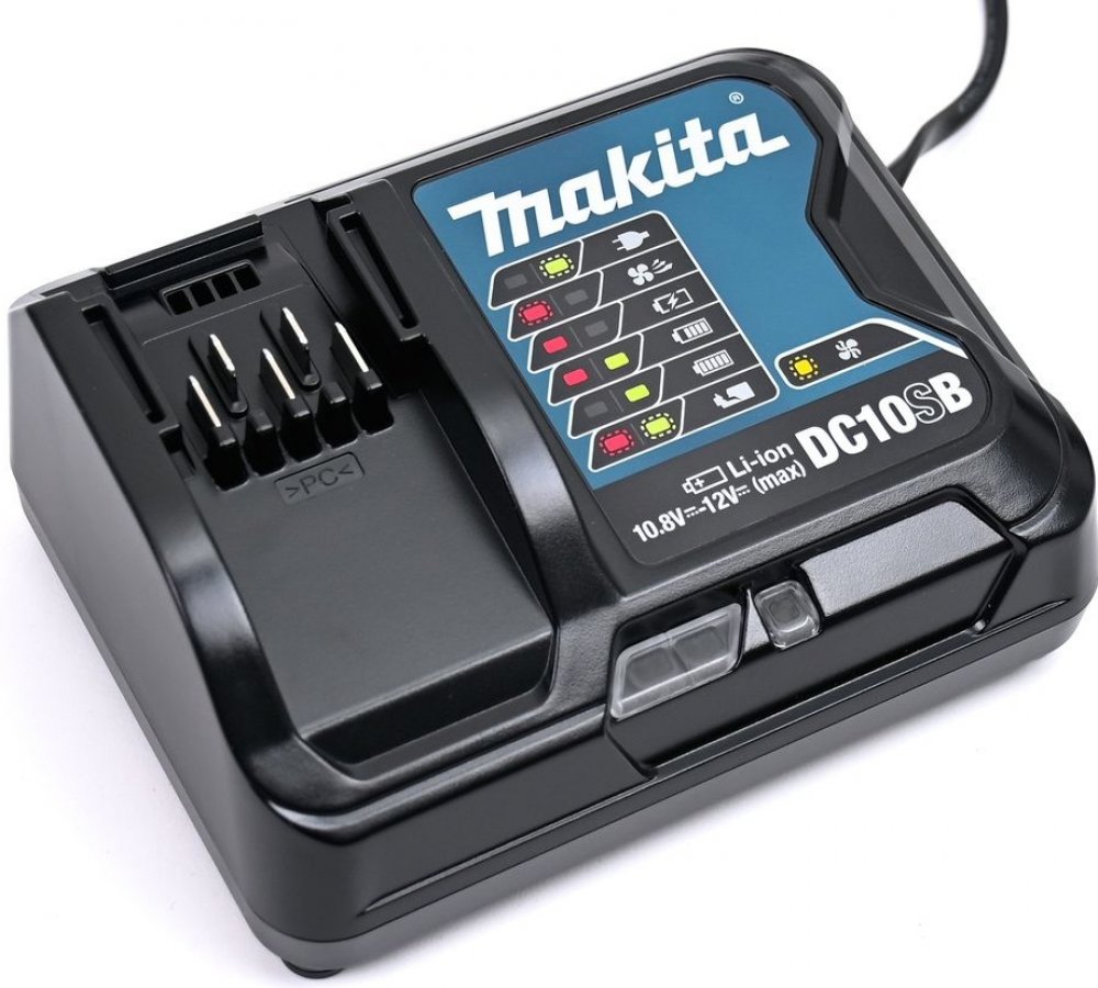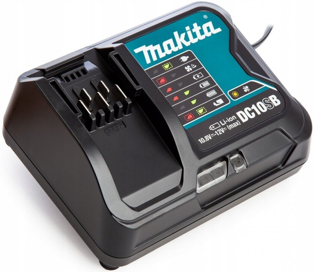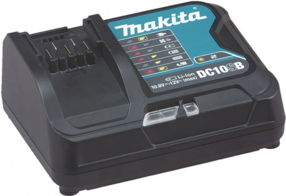 Model Makita DC10SB je vzduchem chlazená rychlá nabíječka vyvinutá speciálně pro nabíjení kluzných lithium-iontových baterií 10,8 V i 12 V typ CXT/ 5 A.