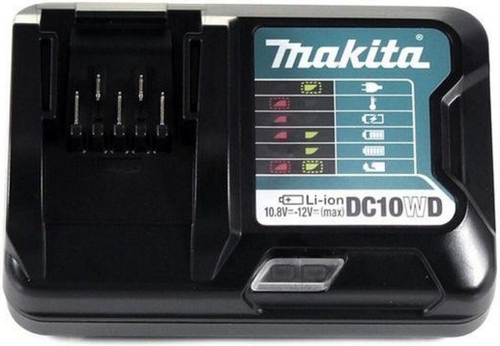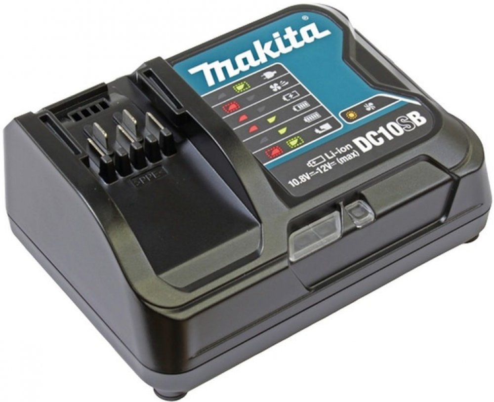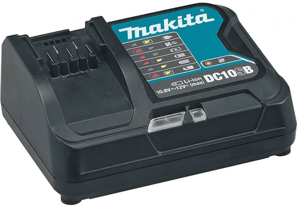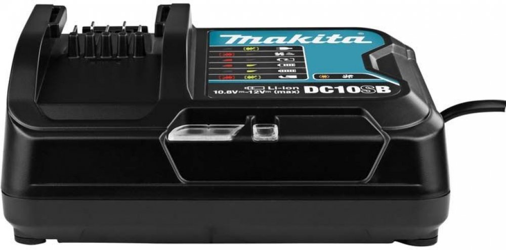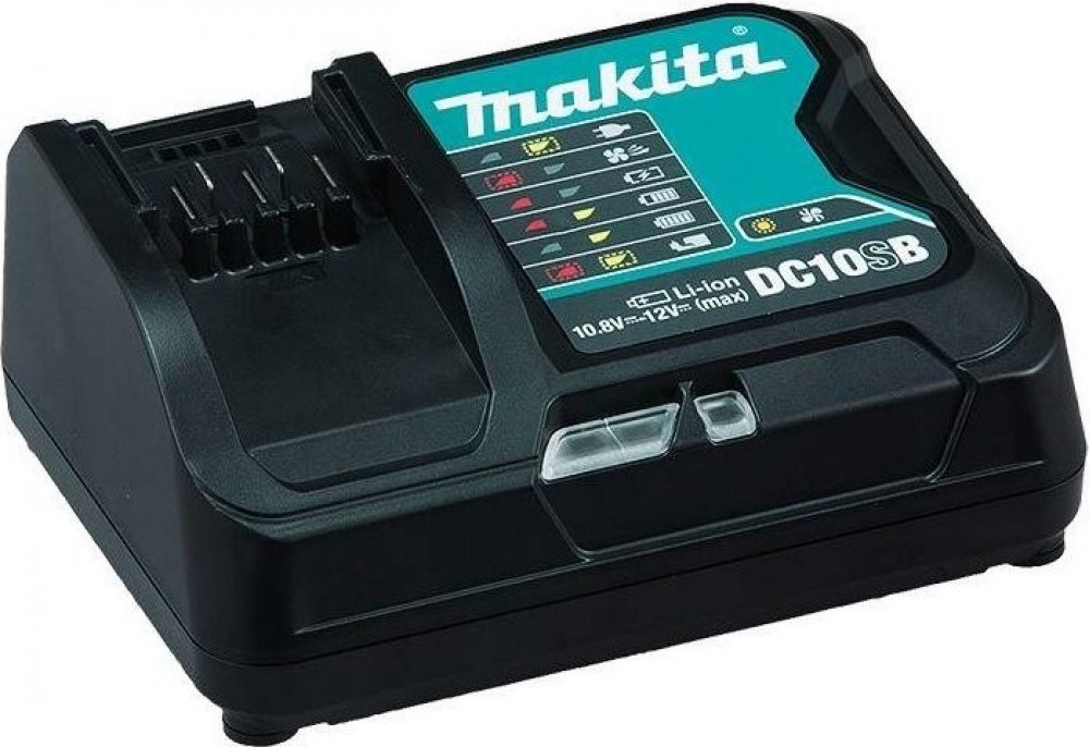 Model Makita DC10SB je vzduchem chlazená rychlá nabíječka vyvinutá speciálně pro nabíjení kluzných lithium-iontových baterií 10,8 V i 12 V typ CXT/ 5 A.