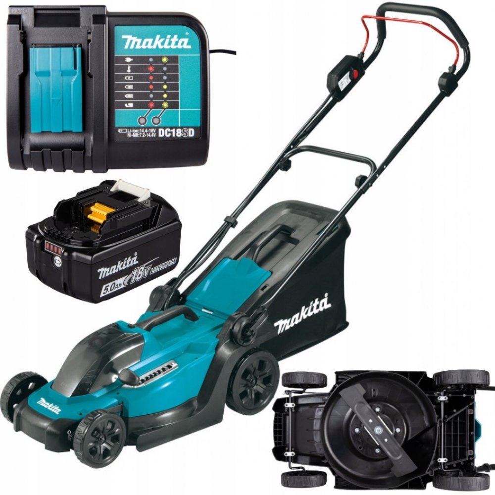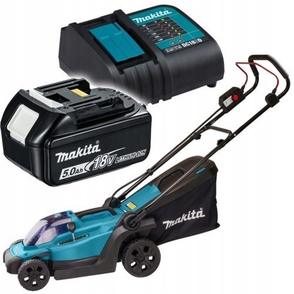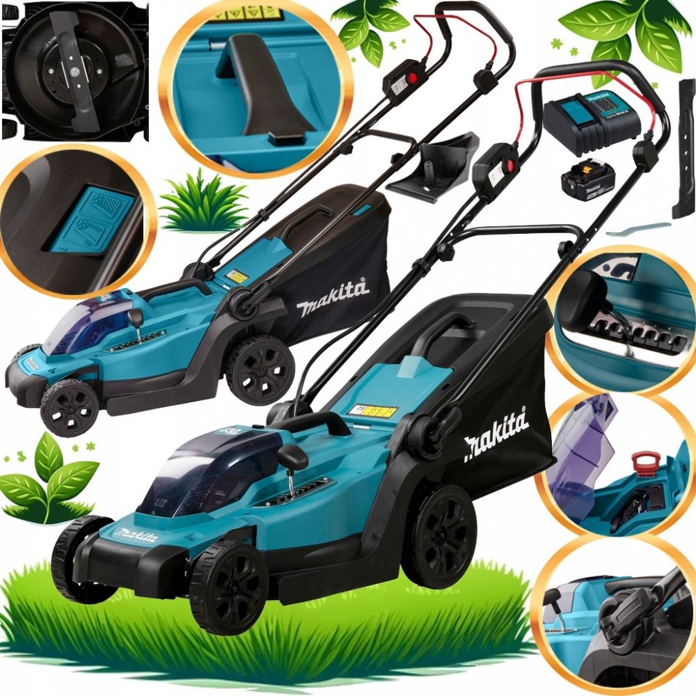 Makita 33 cm 89 dB plastové 12.5 kg bez pojezdu akumulátorové rotační 30 l 270 m2 18 V 5 Ah elektromotor 4300 ot/min 75 mm 2 s látkovým košem