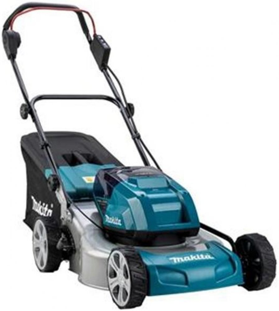 Makita 46 cm 85 dB ocel 27.6 kg bez pojezdu akumulátorové rotační 60 l 800 m2 18 V s elektromotorem 3300 ot/min 75 mm 1 s plastovo-látkovým košem bez aku 149 x 46 x 102 cm 10