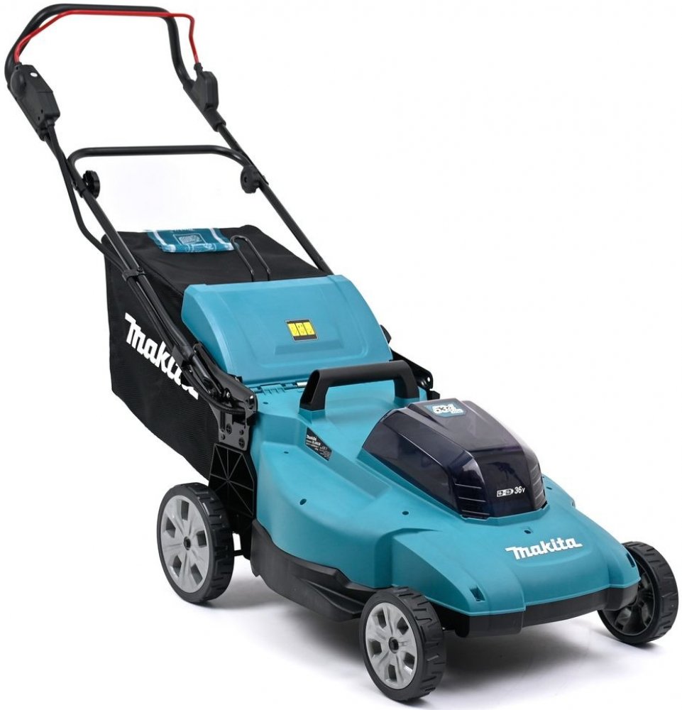 Makita 860 W 53 cm plastové 28 kg bez pojezdu akumulátorové rotační 70 l 800 m2 36 V 6 Ah elektromotor 3000 ot/min 100 mm 1 s látkovým košem bez aku