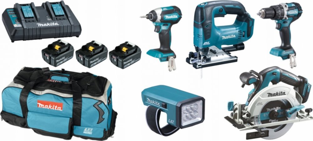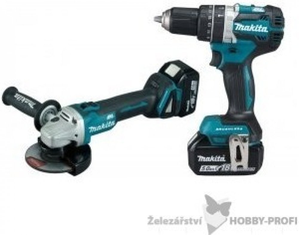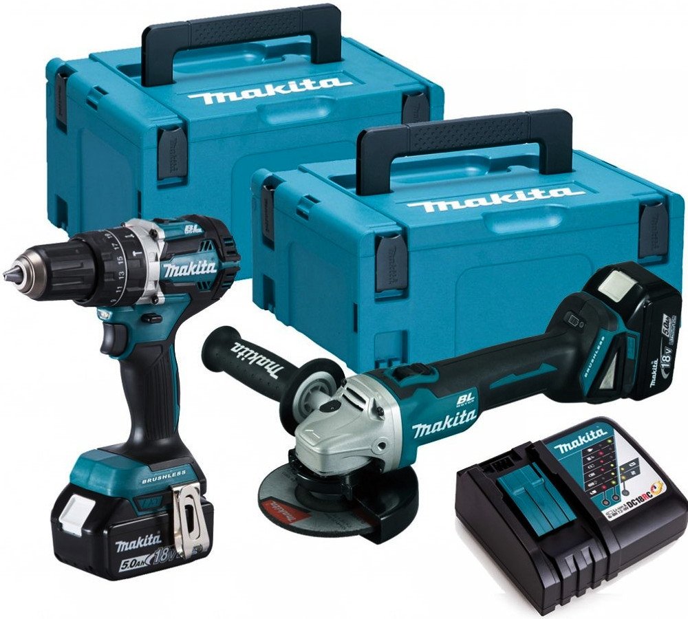 Sada Aku 18V Li-ion strojů od společnosti Makita. Součástí jsou dva stroje: úhlová bruska DGA506 a příklepový šroubovák DHP 484. Sada dále obsahuje 2 kufry Makpac, 2x akumulátor BL1850B a nabíječku.