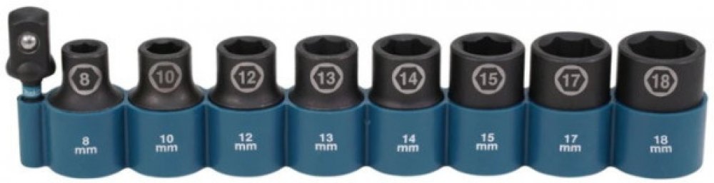 Sada nástrčkových klíčů pro rázové utahováky obsahuje 8, 10, 12, 13, 14, 15, 17, 18 mm ořechy, adaptér 1/2" čtyřhran na 1/4" šestihran.