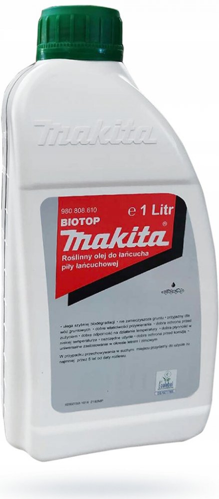 Biologický mazací řetězový olej Dolmar Biotop 1L: Rostlinný olej na mazání řetězu Biologicky odbouratelný Odstraňuje madměrné tření Vysoká přilnavost Konstantní vlastnosti při různých teplotách Zajišťuje plynulý rozběh S datem plnění Biotop od Makity splňuje přísné požadavky a minimálně zatěžuje životní prostředí Díky jeho mazacím schopnostem prodlužuje životnost řetězu. Obsah: 1 litr Obj.č. 1910U...