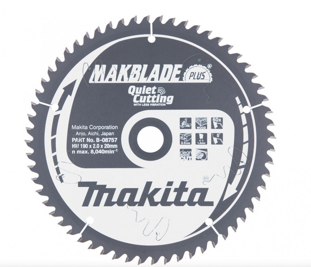 Pilový kotouč na dřevo pro pokosové a stolní pily Makita B-08757 MAKBLADE Plus, 190x20mm, 60 zubů Pilové kotouče MAKBLADE PLUS Pilové kotouče pro pokosové a stolní pily mají jedinečnou patentovanou technologii. Tyto kotouče jsou vyvinuté k pohlcení vibrací a velice tichému chodu. Mají vlastnosti zlepšující pracovní prostředí, životnost kotouče a spolehlivost celého zařízení. Kotouč s menšími vibra...