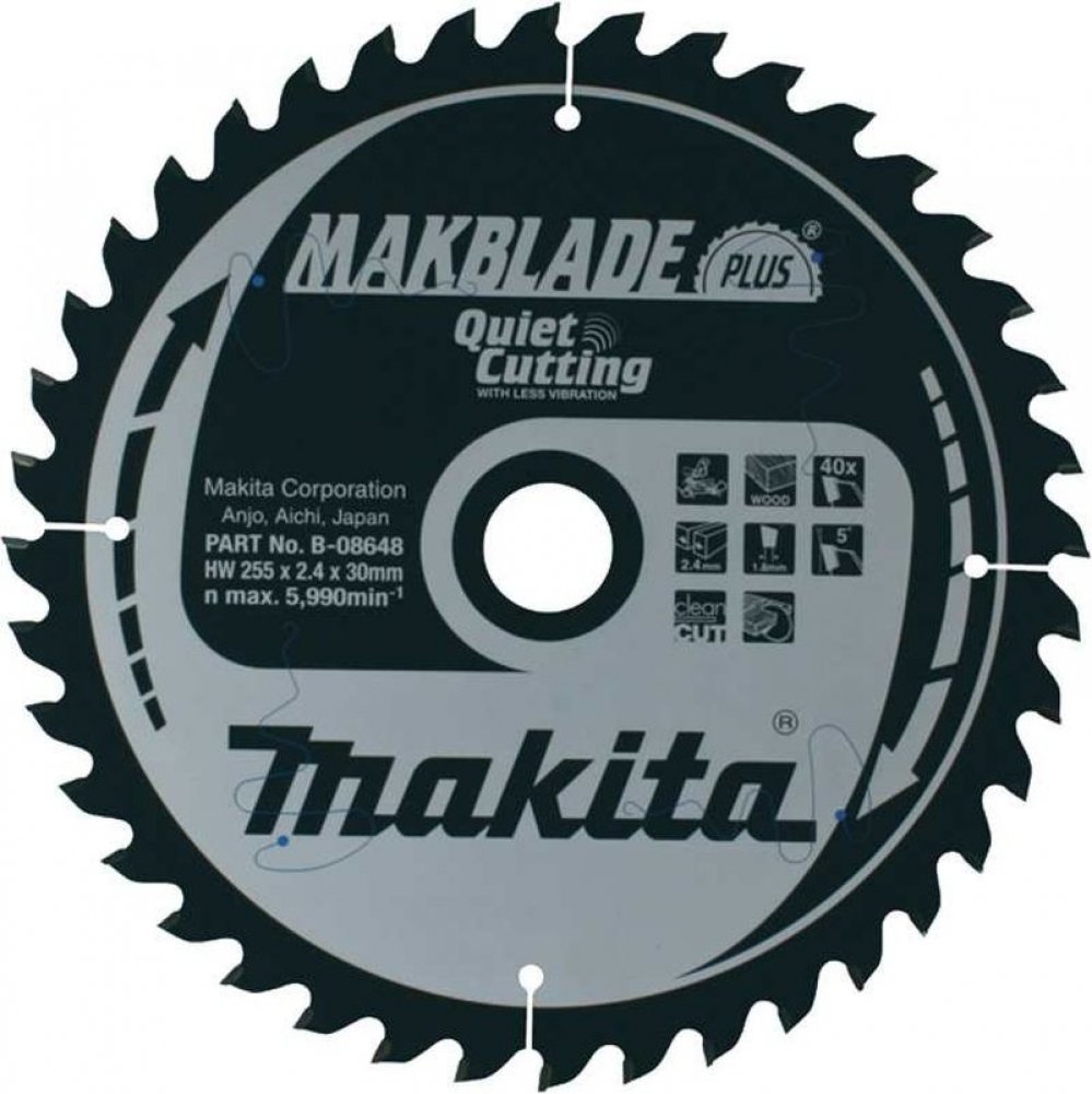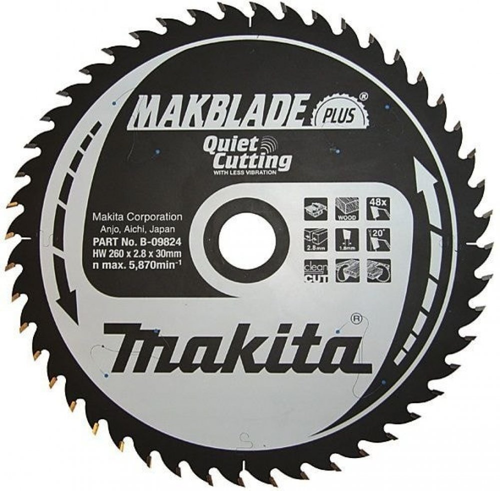 Makita pilový kotouč MAKBLADE PLUS 260x2,3x30 Z100. Pilové kotouče Makblade Plus pro pokosové a stolní pily mají jedinečnou patentovanou technologii. Tyto kotouče jsou vyvinuté k pohlcení vibrací a velice tichému chodu. Mají vlastnosti zlepšující pracovní prostředí, životnost pilového kotouče a spolehlivost celého zařízení. Kotouče s menšími vibracemi zajistí přesnější vedení řezu a také snižují házivost. Výsledným efektem je ideální řezná plocha. Také má za důsledek významně delší životnost zubů z karbidu wolframu překračující životnost konvenčních pilových kotoučů s karbidovými hroty. Systém pohlcení vibrací s vlastnostmi pryskyřicové vazby vyplňující štěrbiny laserového řezu. Přesné vyztužené listy s plošším ostřím a rovnějším řezem. Povrchová vrstva s velice malým třením znamená řezání bez námahy a ochranu před korozí. TICHÉ ŘEZÁNÍ - Povrchová vrstva s velmi malým třením. Hlučnost pilového listu je jednou z hlavních nepříjemností na pracovišti a listy MakBlade Plus zajišťují méně hlučné pracovní prostředí.
