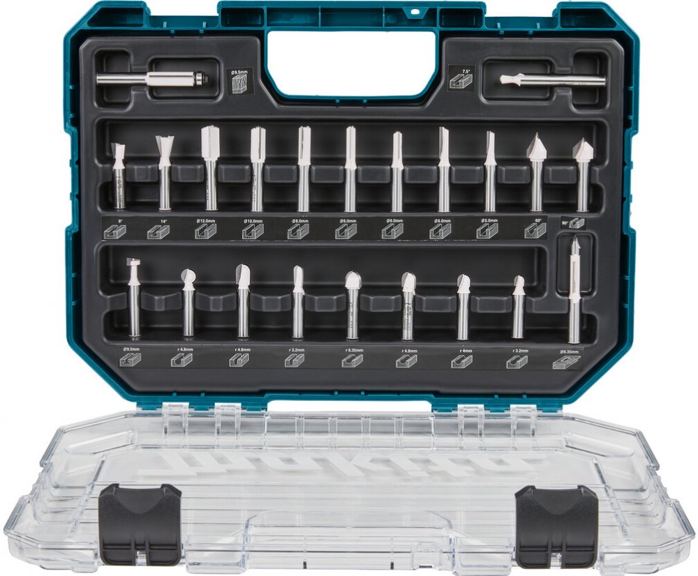 Rozsáhlá 22dílná sada frézek Makita v čirém plastovém pouzdře s průhledným víkem. Maximální rychlosti jsou uvedeny na zadní straně pro každou frézu. Sada se skládá z: Drážkovací fréza 2 řezné hrany 12x19mm - 10x19mm - 8x19mm - 6x19mm - 6x16mm Drážkovací fréza 1 řezná hrana 6x19mm - 5x13mm Fréza na dutý profil 6,35x6,35mm R3,2 mm R67x91x - R67,91x. 0,5mm R4,8 - 6,35x12,7mm R3,2 - 9,5x12,7mm R4,8 V-drážka fréza 12,7mm 60gr - 12,7mm 90gr Hranová fréza 9,5mm Rybinová fréza 12,7mm -9,5mm 9,5mm Vrtací fréza 5,3mm Fréza na klíčové dírky 9,5 mm Kulová fréza 9,5 mm R4,8