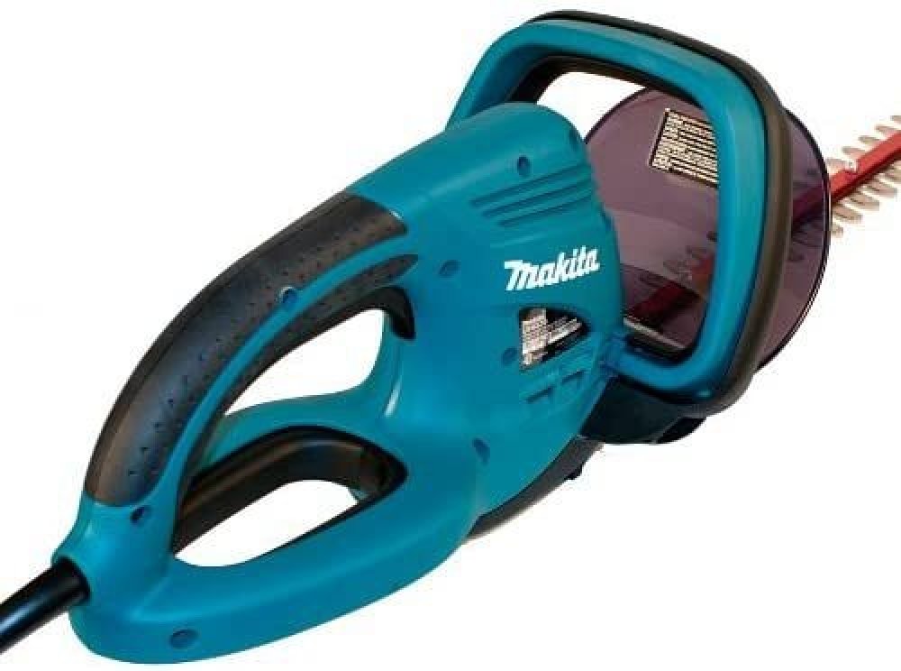 Makita UH5570 je vybaven ergonomicky tvarovanou a pogumovanou protiskluzovou rukojetí, díky které vám plotostřih perfektně padne do ruky a zajistí maximální komfort i při delší práci. Pro bezpečnost uživatele zde najdete hned tři vypínače – stroj funguje pouze při současném stisknutí dvou z nich, čímž je minimalizováno riziko nechtěného spuštění. Oboustranné nože se speciální povrchovou úpravou garantují dlouhou životnost a přesné stříhání větví.