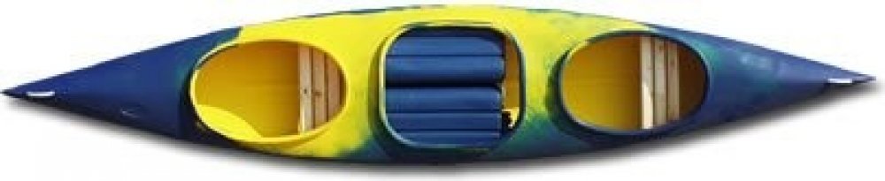 Zavřená plastová kanoe s dvěma otvory pro posádku a jedním velkým pro zavazadla, délka 445 cm, šířka 80 cm, hmotnost do 37 kg, nosnost 300 kg.