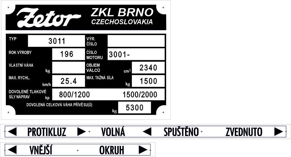 Výhodná malá sada štítků Zetor, výrobní štítek, popis ovládání vnitřního a vnějšího hydr. okruhů. Typ dle názvu produktu.