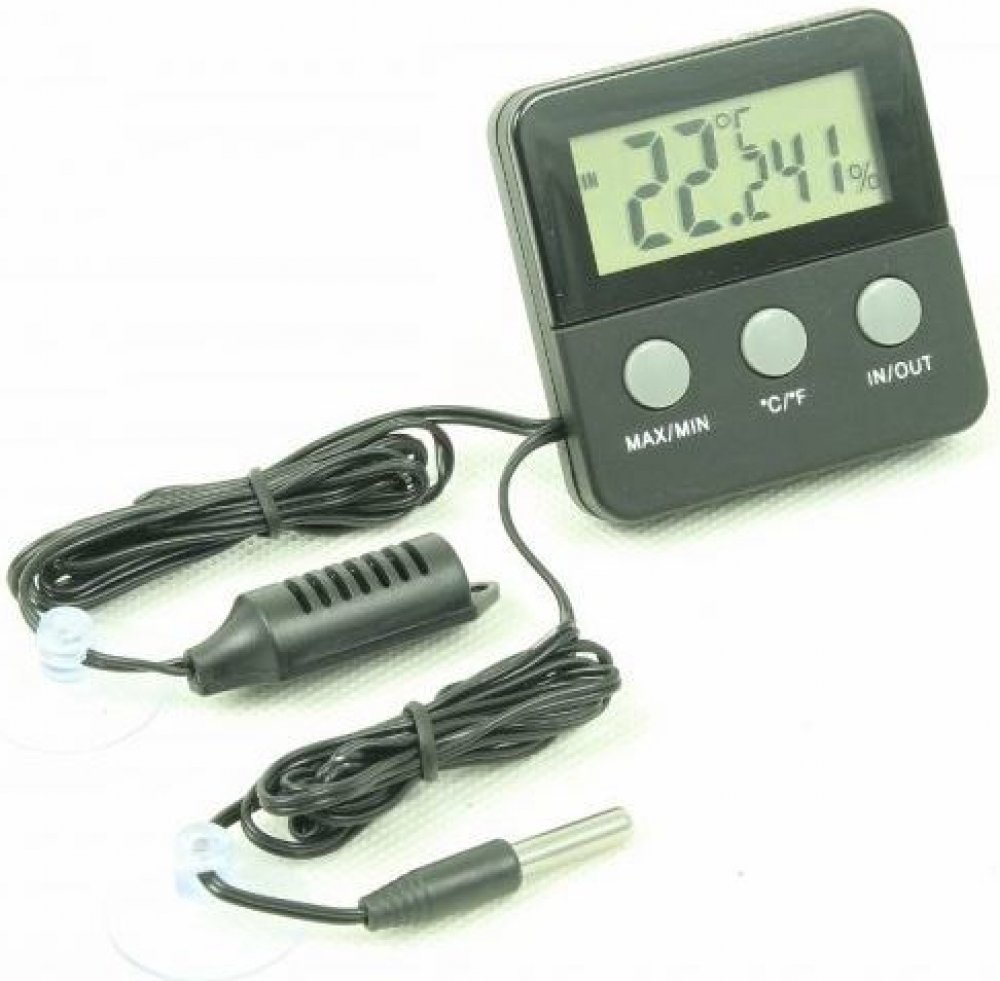 Digitální teploměr a vlhkoměr nebo také thermo hygrometr. Teploměr slouží k měření a zobrazení teploty (více info na Wikipedia.cz). Vlhkoměr zase měří a zobrazuje vlhkost (více info na Wikipedia.cz). Všechny naměřené hodnoty jsou zobrazeny na přehledném LCD displeji. Rozsah měření vnitřní teploty -10° až 50°C, vnější teploty -50° až 70°C. Rozsah měření vnější vlhkosti 20% až 99%RH. Zobrazení teploty v °C nebo °F a vlhkosti v %RH (relativní vlhkost). Zobrazení minimálních a maximálních hodnot s možností vymazání. Každé vnější drátové čidlo s celkovou délku sondy 1 metr. Pro přichycení čidla pro teplotu i vlhkost slouží přísavky. Napájení přístroje zajišťuje jedna AAA baterie. Umístění na plochu, nebo na stěnu. Externí teploměr a vlhkoměr vhodný pro chovatelství, potravinářství, průmysl, školství, vědu, výzkum, stavebnictví. Správná teplota a vlhkost určitě zamezí škodám na Vašem zdraví, majetku, zvířatech, nebo plodinách. Tabulku obsahu vody ve vzduchu v závislosti na teplotě najdete ve fotogalerii.