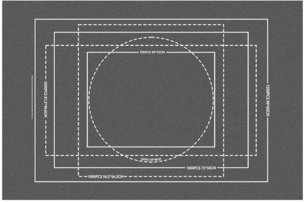 - TIŠTĚNÝ VZOR 6 VELIKOSTÍ PUZZLE - podložka má tištěná pole, které pomáhají řešit hádanky, jedná se o označení okrajů 6 základních velikostí skládačky.