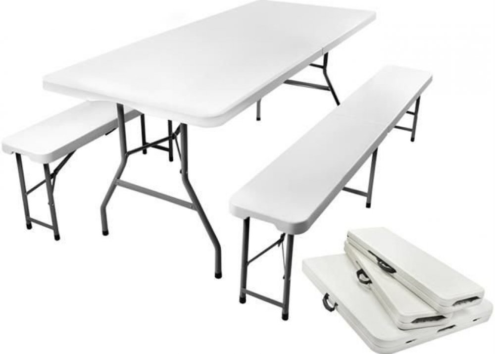Souprava zahradního stravování je ideální volbou pro lidi, kteří oceňují jednoduchost a funkčnost. Ideální pro venkovní akce, v banketových sálech, v restauracích nebo pro domácí použití. Nábytek má ocelovou konstrukci s práškovým nástřikem a extrémně pevné a hrubé plastové desky, díky čemuž je odolnost vůči příznivému povětrnostům. Po složení je nábytek vhodný pro přepravu a skladování. Vejdou se do auta a nezaberou mnoho místa v garáži či na půdě.
