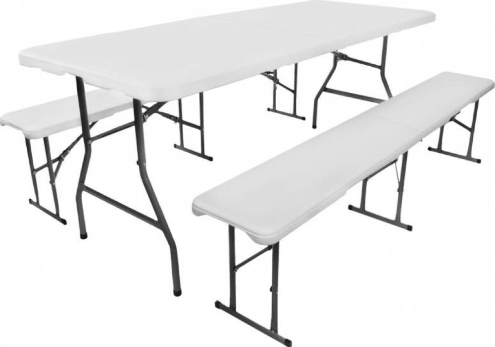 STŮL S LAVICEMI - rozkládací sestava zahradního nábytku je dokonalým řešením pro všechny venkovní akce. Je mimořádně praktická a pohodlná. Má pevnou strukturu a hrubý vrch – to vše odolné vůči nepříznivým povětrnostním podmínkám. Pár jednoduchých pohybů stačí k tomu, abyste si na zahradě vytvořili dokonalý gastro koutek, který dobře poslouží na festivalech, velkých akcích a grilovačkách.