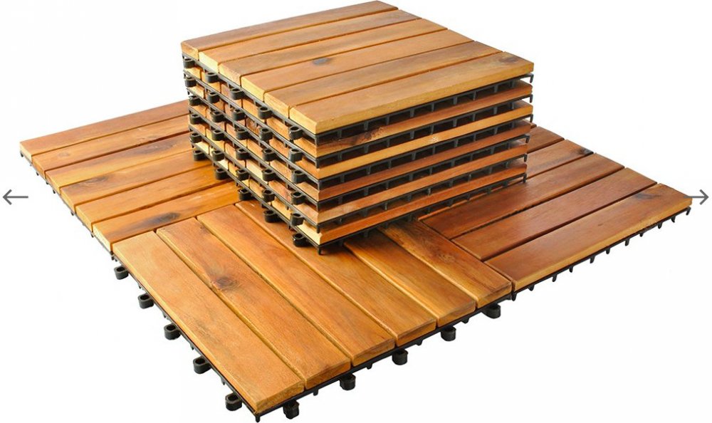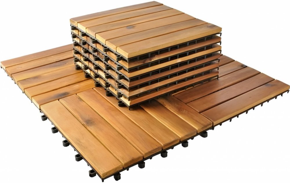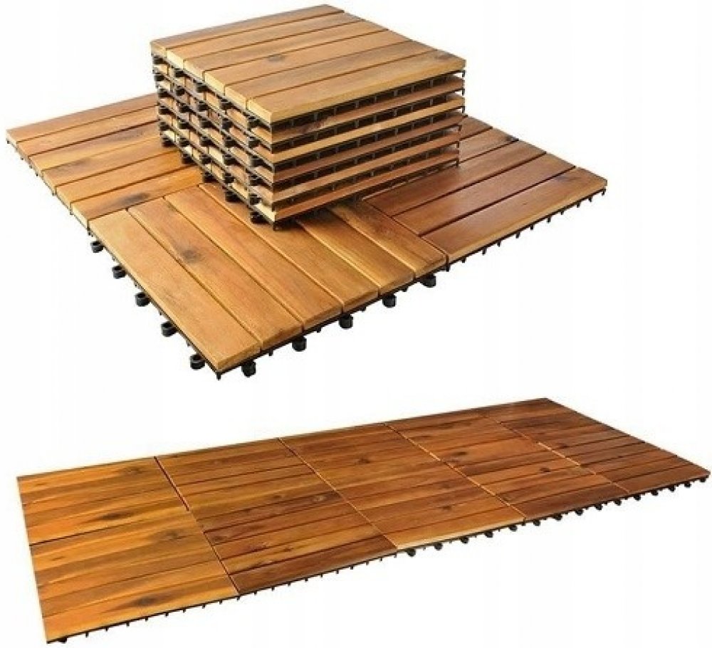 Odolné dřevěné dlaždice - Plug-in systém. Použití dřevěných dlaždic je způsob, jak snadno a rychle připravit místo bez časově náročných a drahých montážních prací. Vhodné na balkón, terasu, zahradu nebo do koupelny.