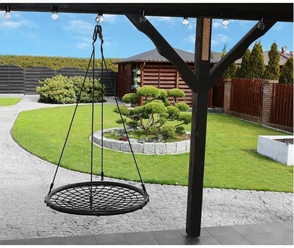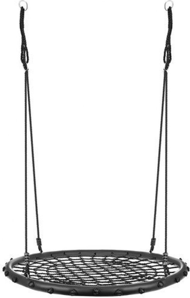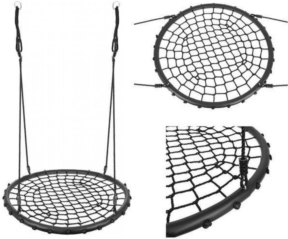 Závěsný houpací kruh s kovovou konstrukcí obalenou pěnou pro snížení rizika zranění. Sedák ve stylu pavučiny z vysokopevnostních pletených nylonových šňůr. Pevná lana jsou opatřena kovovými kroužky pro upevnění. Díky výškovému nastavení lana, lze houpačku přizpůsobit výšce i těch nejmenších uživatelů.