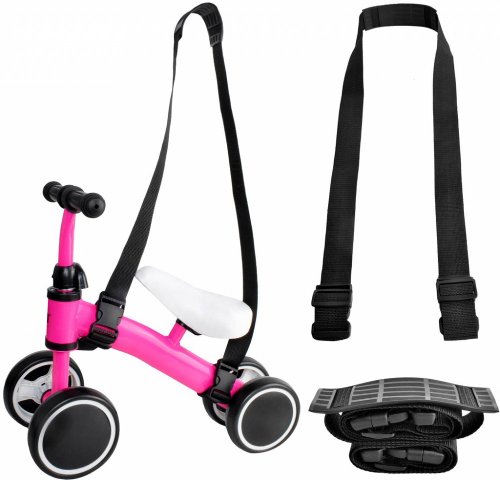 Univerzální transportní popruh pro nošení odrážedla, koloběžky nebo jiných potřeb je mimořádně funkční pomůcka, zejména pro rodiče.