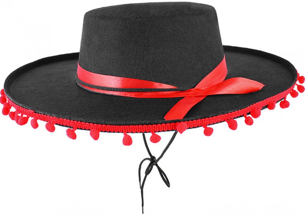 Mexické sombrero s bambulkami je vyrobeno z textilu s plstěným povrchem. Klobouk má vnitřní obvod 42 cm, celkový průměr 40 cm a šířku stříšky 9 cm. Po bocích je zdoben rudými bambulkami. Klobouk je rovněž vybaven šňůrkou pro uvazování klobouku na hlavě. Tento klobouk je černé barvy a díky jeho mexickému designu je tak ideální pro kostýmy na párty, halloweenské kostýmy...