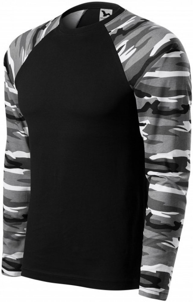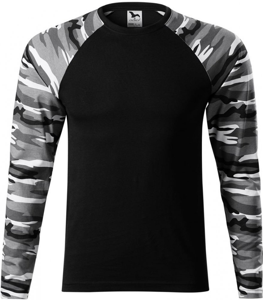 Střih s bočními švy, úzký lem průkrčníku z žebrového úpletu 1:1 s 5 % elastanu, vnitřní část průkrčníku začištěna páskou v barvě 01, dlouhé raglánové rukávy v barvě camouflage, produkt se již do budoucna nebude naskladňovat