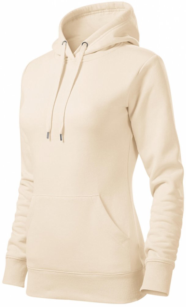 lehce vypasovaný střih s bočními švy kapuce s podšívkou, na stažení šňůrkou vnitřní část průkrčníku začištěna páskou v barvě vrchového materiálu nakládaná kapsa ve stylu klokanky dolní lem a manžety rukávů z žebrového úpletu 2:2 s 5 % elastanu vnitřní strana počesaná