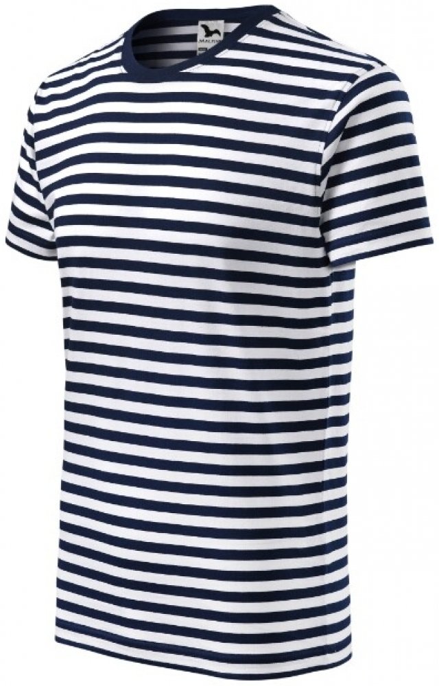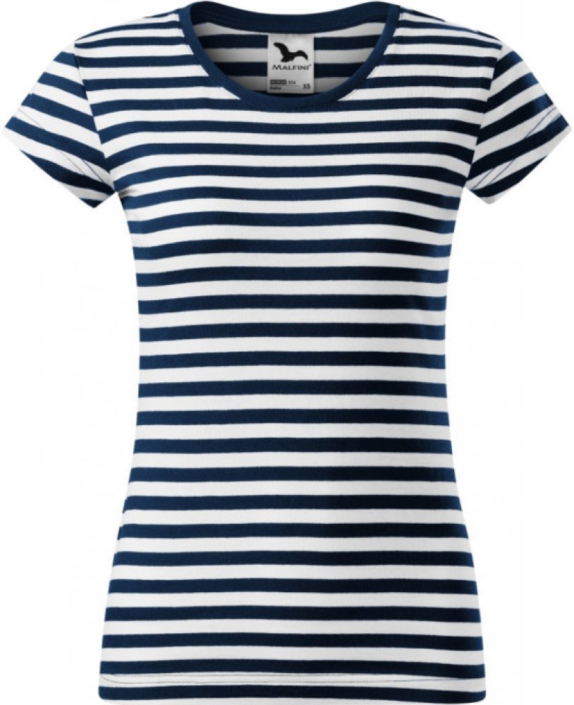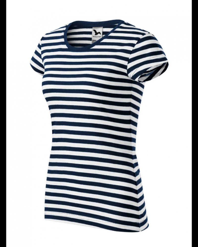 Dámské pruhované tričko s rukávem kratší délky. Dámské tričko v námořnickém vzhled vypasovaného střihu. Výstřih je hlubší a kulatý, úzký lem z žebrovaného úpletu 1:1 s 5% elastanem. Vrchní část průkrčníku je začištěna páskou. Ramenní švy jsou také zpevněny páskou.