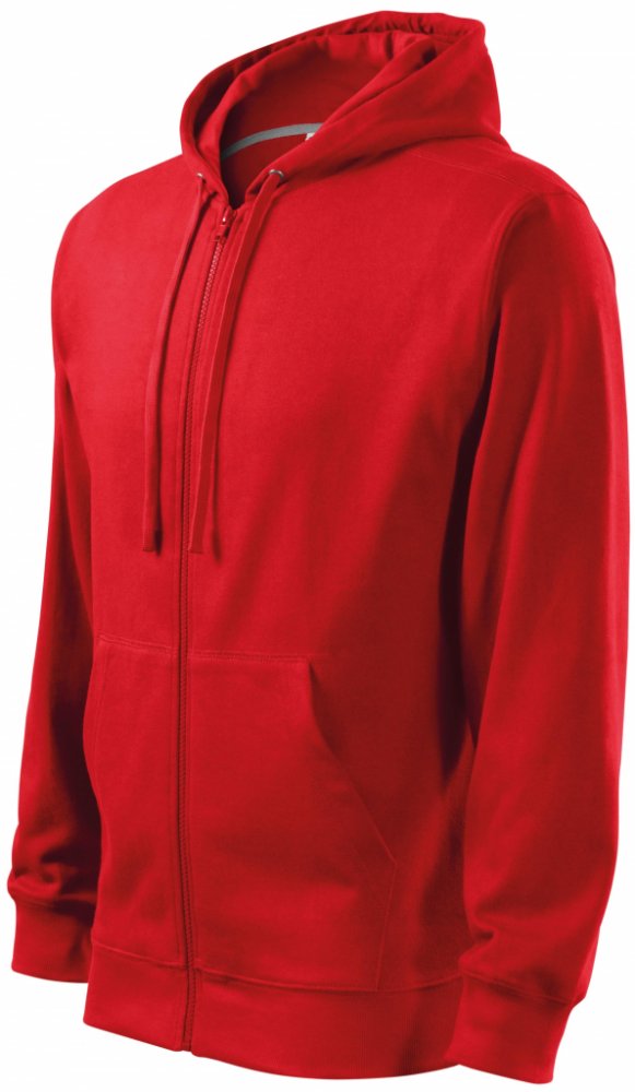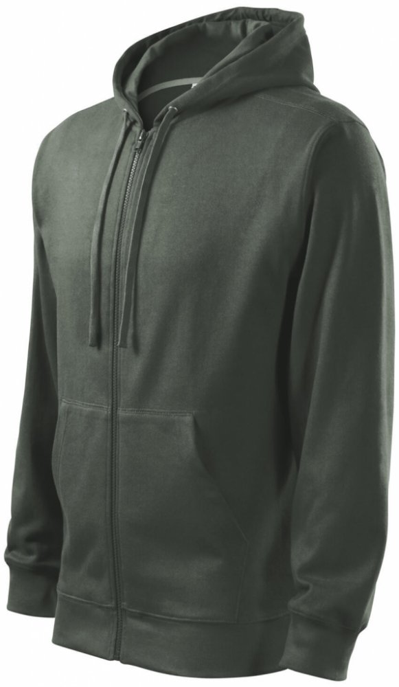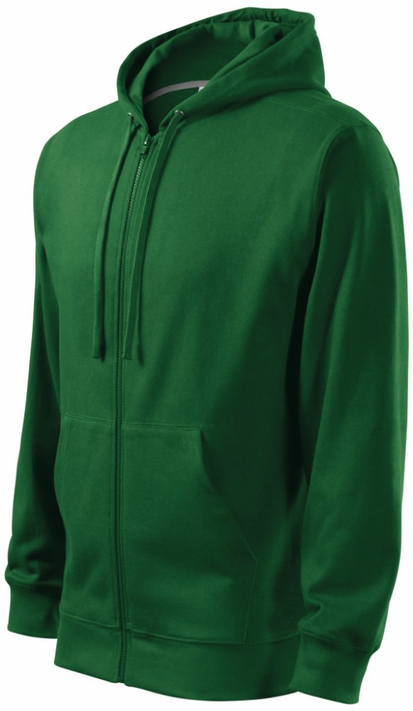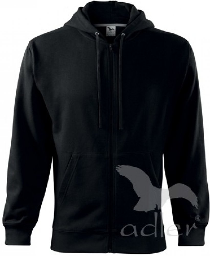 Rovný střih s bočními švy, celopropínací kostěný zip, kapuce s podšívkou, na stažení šňůrkou, vnitřní část průkrčníku začištěna kontrastní páskou, nakládané kapsy ve stylu klokanky, dolní lem a manžety rukávů z žebrového úpletu 2:2 s 5 % elastanu, vnitřní strana počesaná
