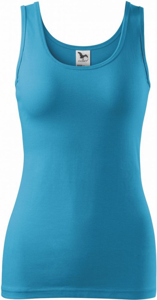Strečový materiál udržující stálost tvaru, přiléhavý střih s bočními švy, hlubší kulatý výstřih, průkrčník a průramky lemovány vrchovým materiálem, širší ramínka