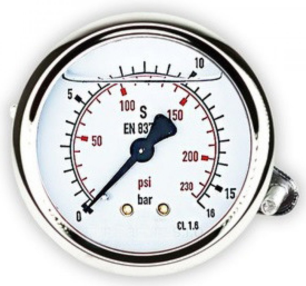 Manometr 1/4" zadním připojením - d63 | 16 bar | glycerinManometr s bajonetem, 1/4" zadním závitovým připojením pro měření tlak vody do 16 barů.AplikaceDá se používat i při okolnostech, kde může nastat pulsace nebo vibraceVýrobní průmyslVhodné pro kapalná i plynná médiaVlastnostiVyrobeno