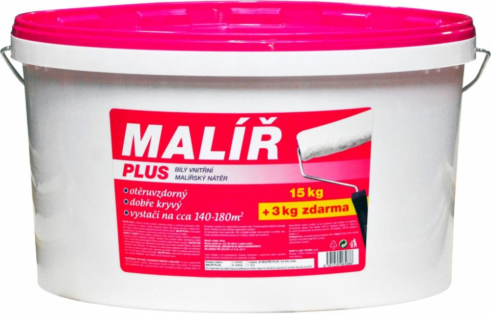 Malíř Plus je disperzní otěruvzdorný malířský nátěr. Je tónovatelný, paropropustný, rychleschnoucí a vysoce kryvý. Lehce se roztírá. Je určen k použití ve vnitřních prostorách. Vydatnost: až 230 m2.