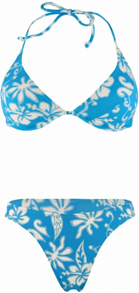 Dámské dvoudílné plavky s květinovým potiskem. Vrchní díl má všité kostice a nevyztužené košíčky. Kalhotky mají vyšší střih a opticky tak prodlouží siluetu postavy. Vhodné pro velikost košíčku B.