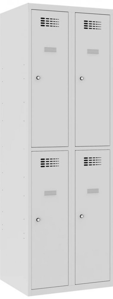 Čtyřdveřová šatní kovová skříňka se svařovanou konstrukcí a moderním designem ventilačního systému. Výška 1800 x šířka 600 x hloubka 500 mm. Standardní vybavení: tyč s háčky, samolepící štítek na jméno. 16 barevných odstínů na výběr v ceně bez příplatku. Různé druhy zamykání.