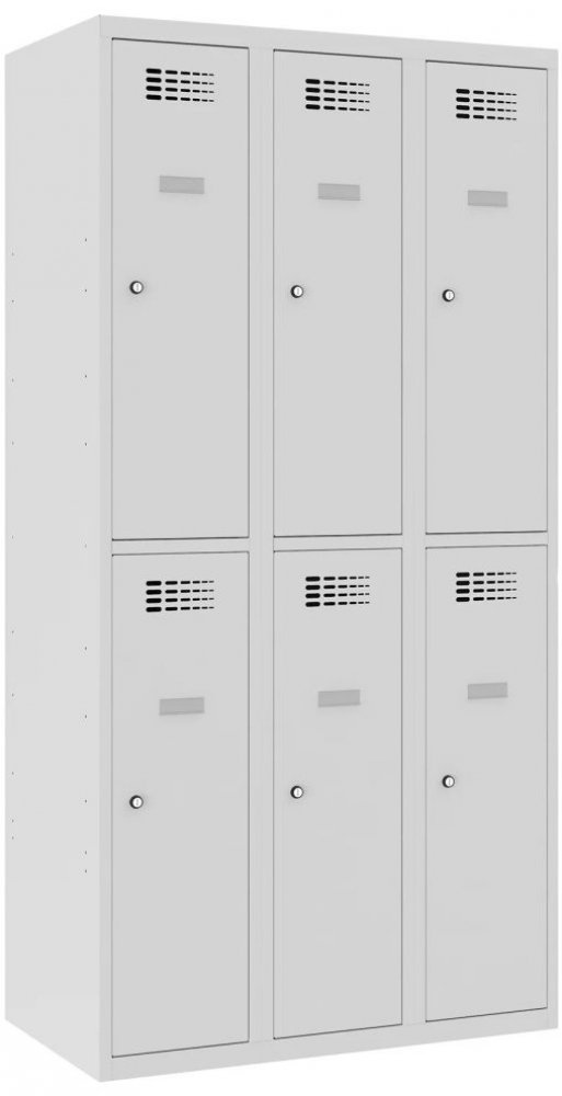 Šestidveřová šatní kovová skříňka se svařovanou konstrukcí a moderním designem ventilačního systému. Výška 1800 x šířka 900 x hloubka 500 mm. Standardní vybavení: tyč s háčky, samolepící štítek na jméno. 16 barevných odstínů na výběr v ceně bez příplatku. Různé druhy zamykání.