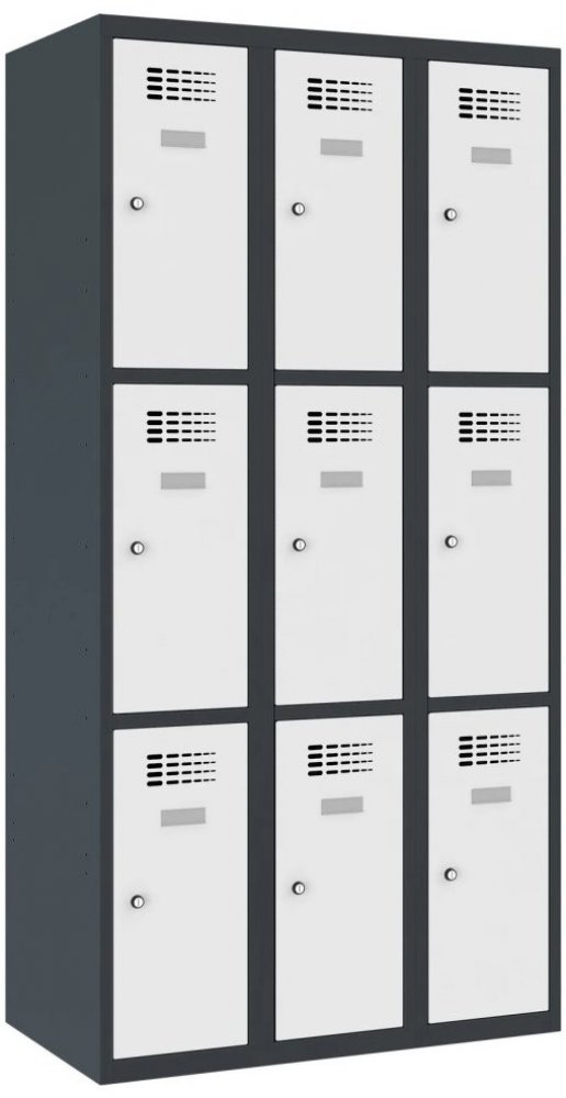 Devítidveřová šatní kovová skříňka se svařovanou konstrukcí a moderním designem ventilačního systému. Výška 1800 x šířka 900 x hloubka 500 mm. Na dveřích samolepící štítek na jméno. 16 barevných odstínů. Různé druhy zamykání.