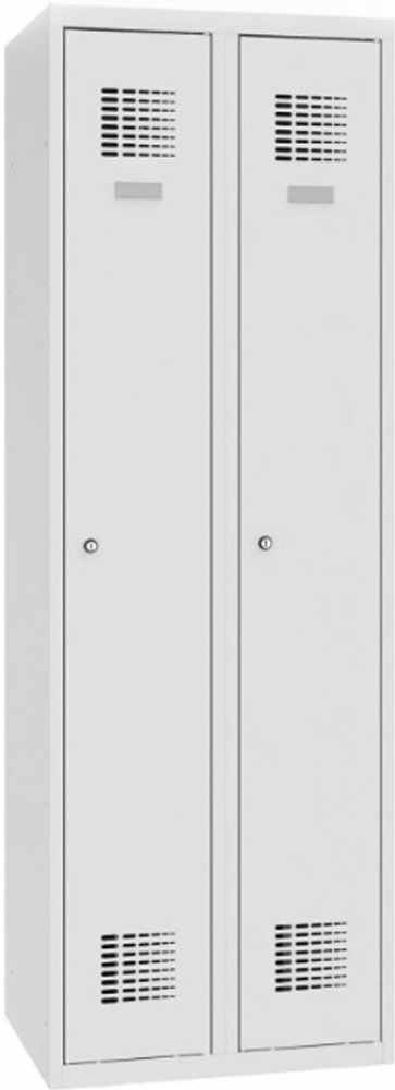 Dvoudveřová šatní skříňka svařovaná s moderním designem ventilačního systému. Výška 1800 x šířka 600 x hloubka 500 mm. Cylindrický zámek. Vybavení obou oddělení: tyč s dvěma háčky, háček na ručník, police nad tyčí, zrcátko, samolepící štítek na jméno.