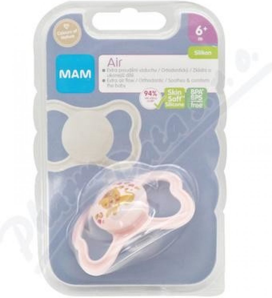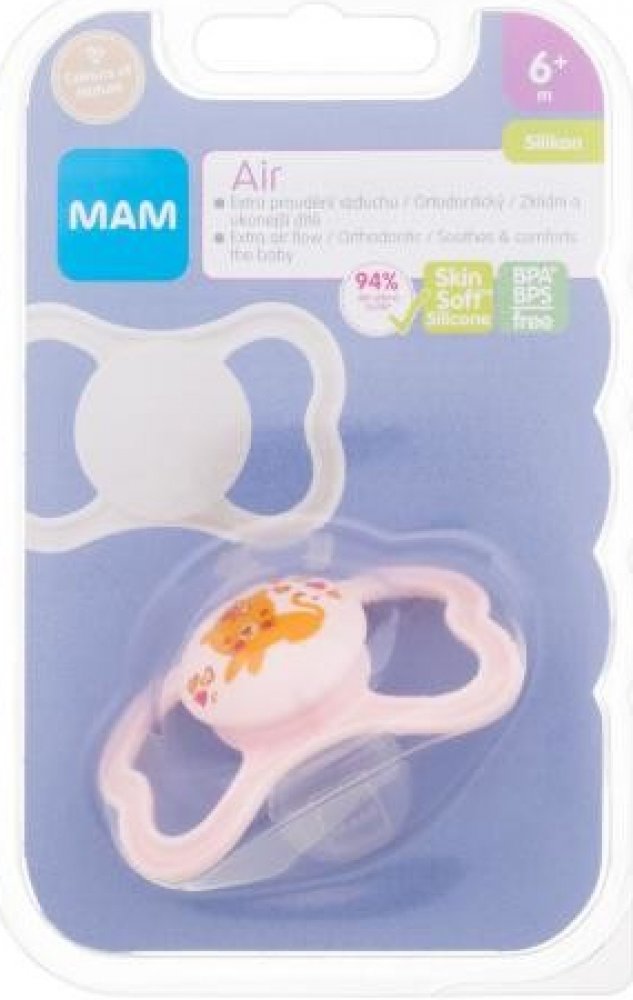 MAM Air je velmi šetrný k dětské pokožce díky extra velkým větracím otvorům v límci dudlíku, které umožňují lepší proudění vzduchu kolem úst, a tím pomáhají zmenšit podráždění pokožky způsobené zachycováním slin.