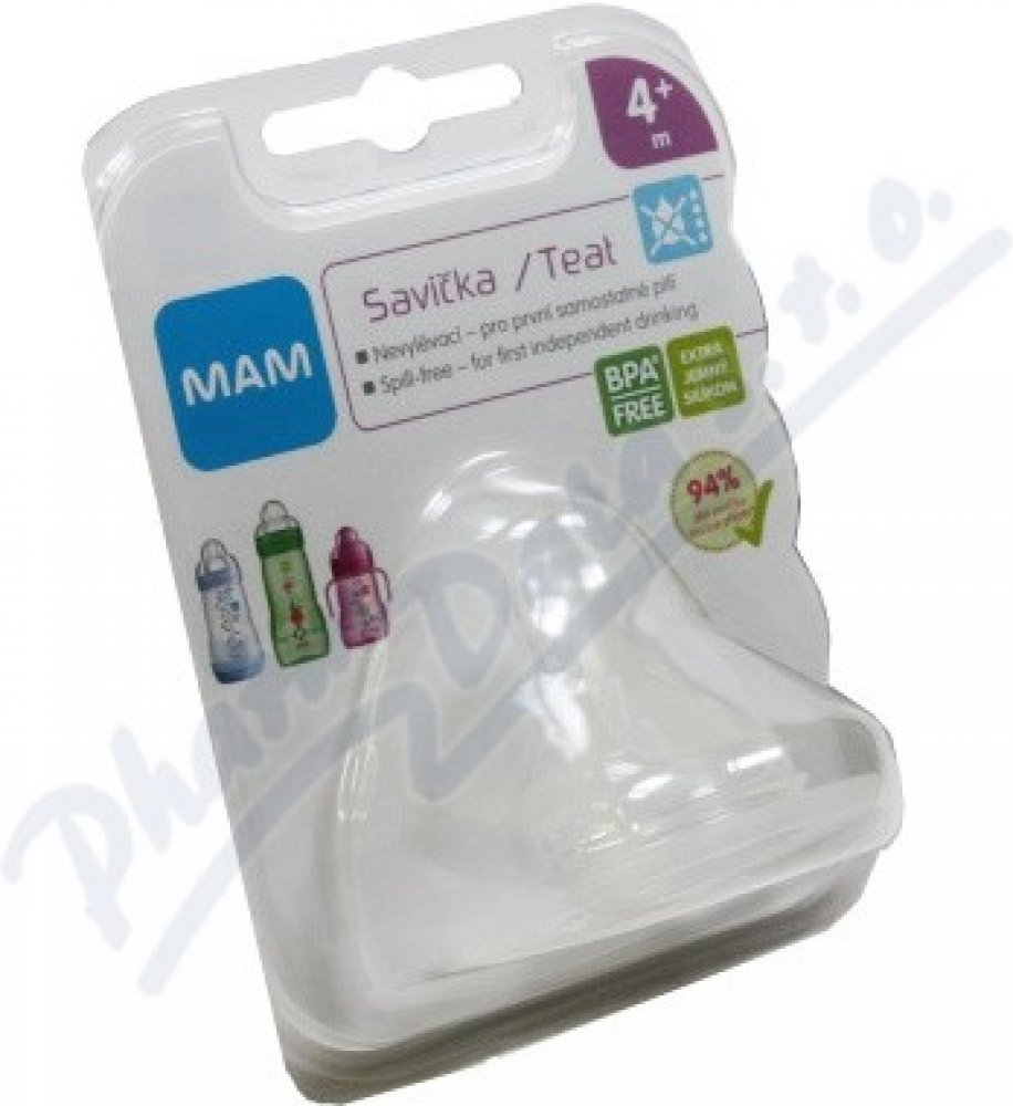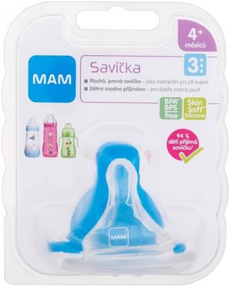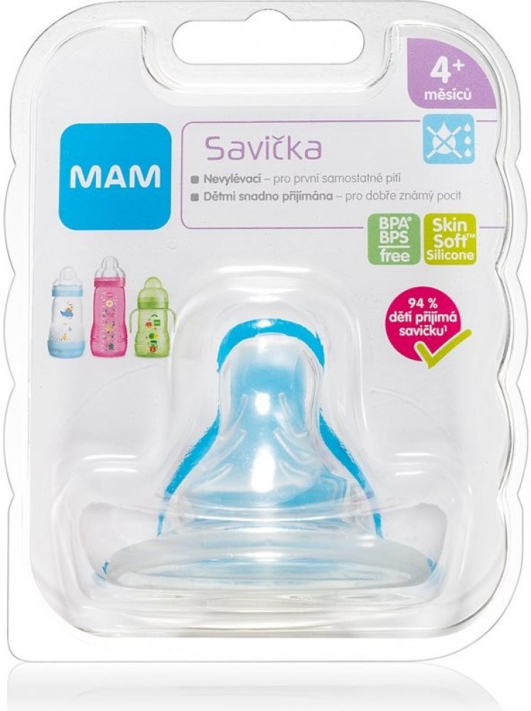 Savička s rychlým a nevylévacím průtokem, která se doporučuje používat od 4. měsíce. Vlastnosti: Nekape – ideální pro první pokusy o samostatné pití. Plochá symetrická savička z vysoce kvalitního silikonu napodobuje maminčin prs při kojení a podporuje tak přirozený sací reflex. Navíc vždy perfektně padne do dětských úst. Savička má patentovaný hedvábně měkký povrch, který mají děti instinktivně rády, protože je na dotek tak důvěrně známá. Prokázáno: 94 % miminek přijímá silikonovou savičku MAM SkinSoft™, která je jemná jako dětská pokožka (průzkum trhu 2009–2017, testováno s 1 508 dětmi). Se speciálním vzduchovým ventilem, který zabraňuje ucpání savičky a umožňuje plynulý tok. Vhodná jak pro mateřské mléko, tak pro kojeneckou výživu. Vhodná pro všechny lahve MAM a Trainer.