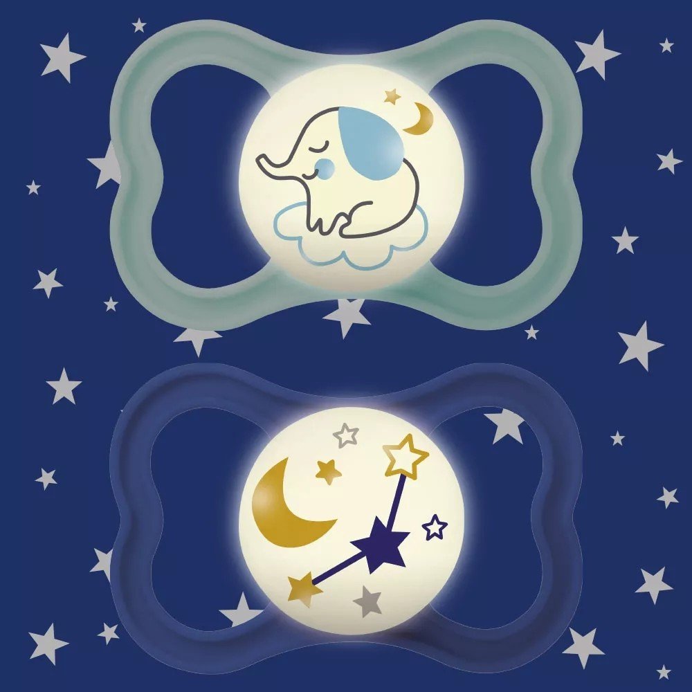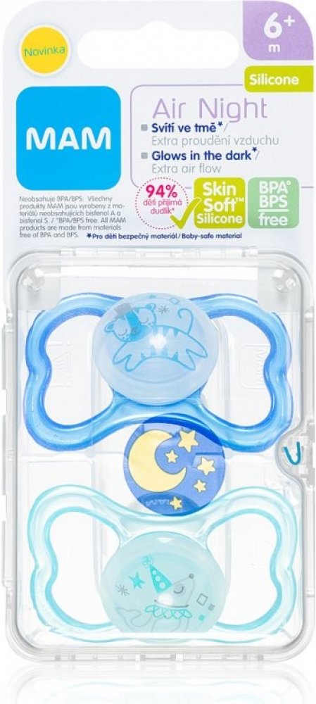 Dudlíky MAM Air Night jsou speciálně vyvinuty pro noční použití – knoflík dudlíku ve tmě svítí, takže ho rodiče i děti mohou snadno nalézt i v noci.