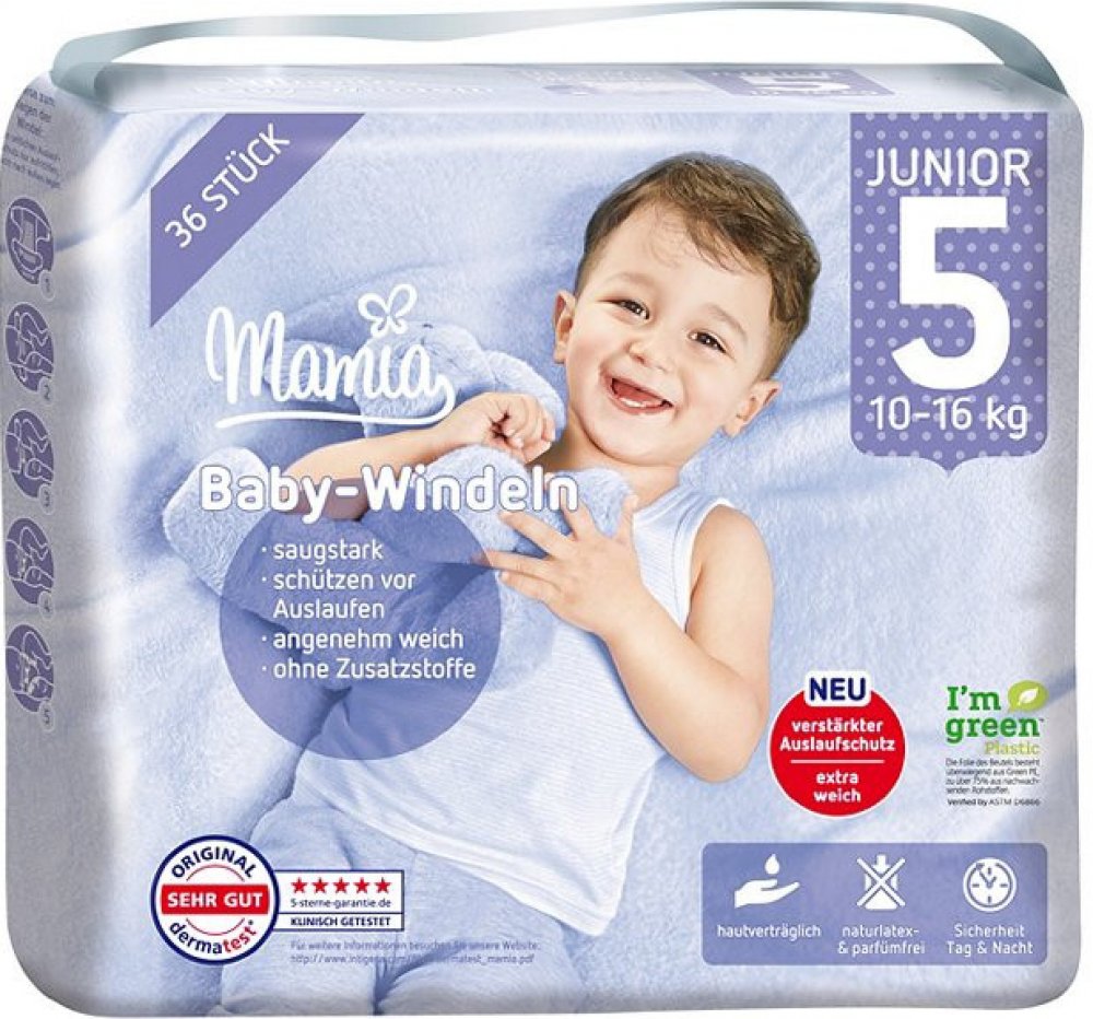 MAMIA - pleny pro váhu 10–16 kg, 36 ks, optimální savost, ochrana proti vytečení na stranách, s elastickými napínacími oušky – roztahují se a smršťují, bezpečný a znovuuzavíratelný suchý zip, silně savé jádro udrží sucho ve dne i v noci, prodyšné – propustí vzduch dovnitř, ale žádnou tekutinu ven, zvlášť měkké – snášenlivost s pokožkou dermatologicky testována. Dovezeno z Německa.