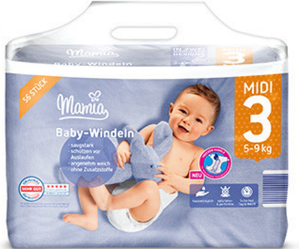 MAMIA - pleny, pro váhu 5-9 kg, 46 ks. Ochrana proti vytečení na stranách, s elastickými napínacími oušky – roztahují se a smršťují, bezpečný a znovuuzavíratelný suchý zip, silně savé jádro udrží sucho ve dne i v noci, prodyšné – propustí vzduch dovnitř, ale žádnou tekutinu ven, zvlášť měkké – snášenlivost s pokožkou dermatologicky testována. Dovezeno z Německa.