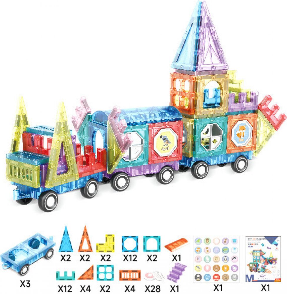 Kreativní magnetická stavebnice umožní dětem sestavit barevné stavby, vozidla a originální konstrukce díky 75 průhledným dílkům. Součástí sady jsou také kolečka, speciální okénkové panely a různé tvary, díky kterým si mohou děti vytvořit například vlastní magnetický vláček nebo dopravní soupravu.