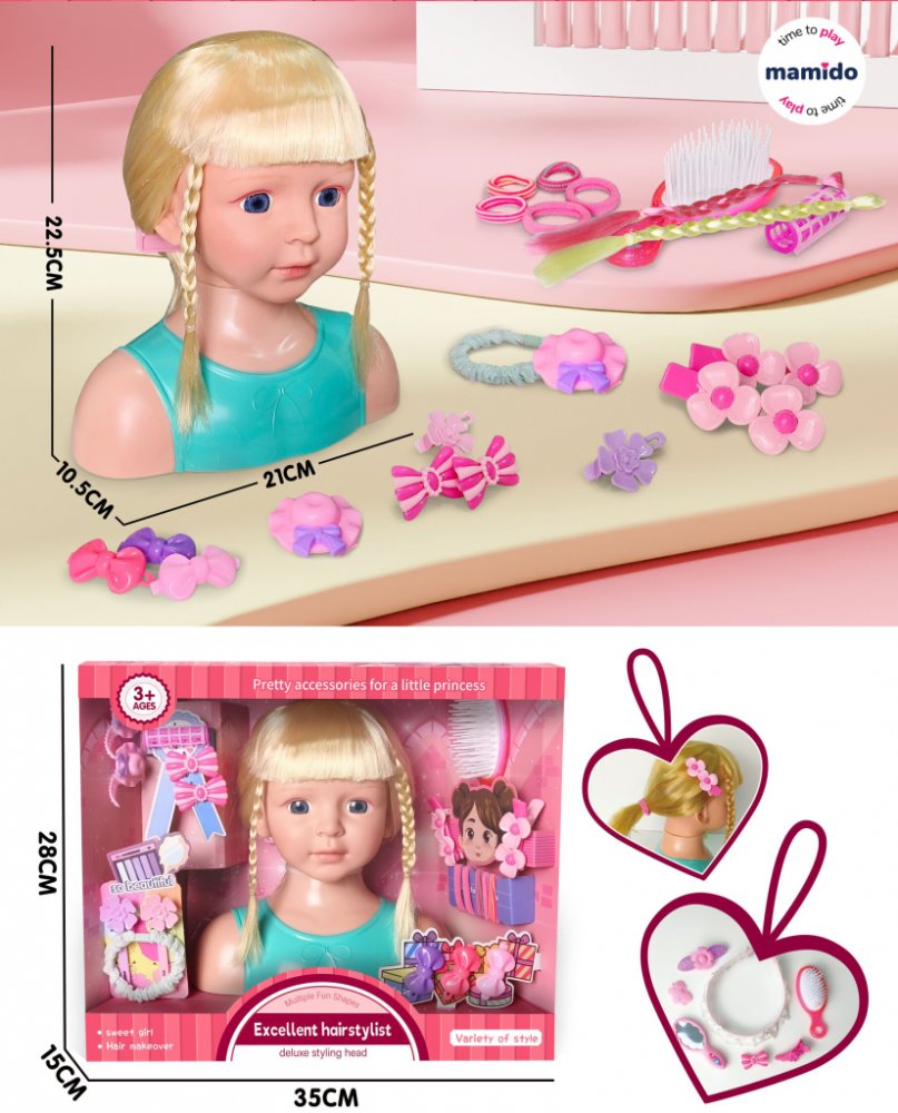 Stylová česací hlava panenky se světle blond vlásky umožní dětem česat, zaplétat, zdobit a vytvářet různé účesy podle vlastní fantazie. Součástí je bohatá sada doplňků, díky kterým se hra promění v malý kadeřnický salon.
