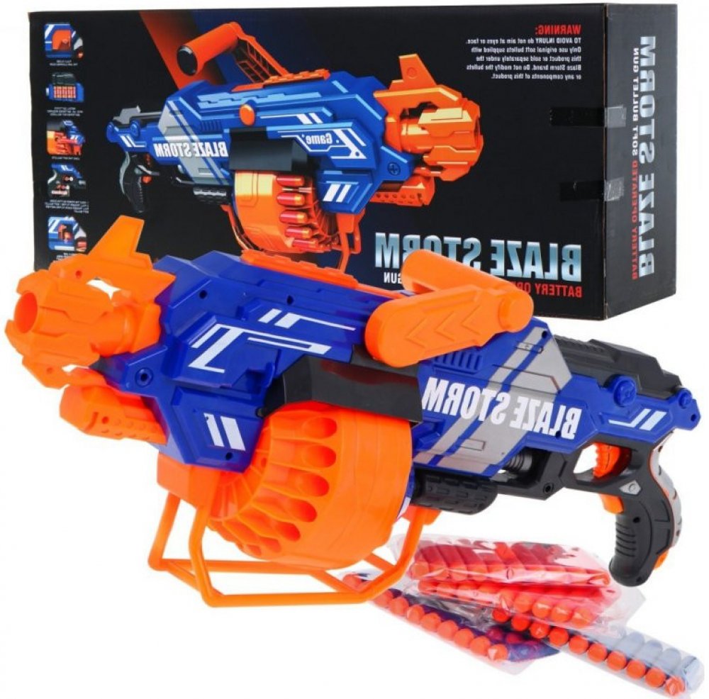 Dětský kulomet Blaze Storm je plně automatická zbraň na pěnové náboje. Pistole se snadno používá a má dlouhý a přesný dosah střely. Jako první musíte do pistole vložit baterie, naplnit zásobník, zamířit a stisknout spoušť. Zásobník pojme až 20 pěnových nábojů. V balení se nachází 20 modrých a 20 červených nábojů. Hračka je vhodná pro děti od 8 let. Pistole je napájena osmi 1,5V AA bateriemi, kter...