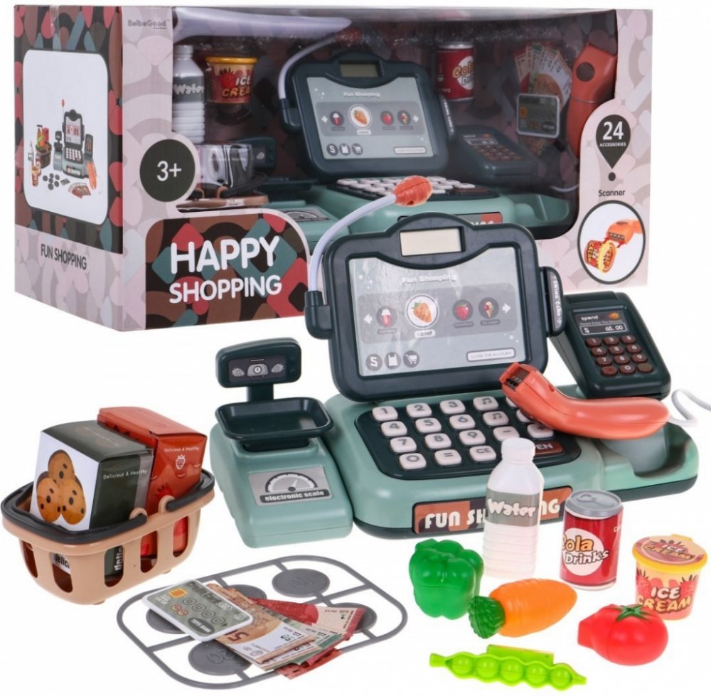 Dětská pokladna se skenerem a čtečkou kreditních karet je ideálním řešením pro všechny děti, které si rády hrají na obchod. Pokladna má mikrofon, LCD displej, kalkulačku a otevírací zásuvku na mince. Během skenování produktu uslyšíte zvuk a cena produktu se objeví na displeji. Můžete zaplatit kartou nebo hotově. Sada obsahuje: Pokladna Váha Čtečka karet Mikrofon Karta Peníze - bankovky a mince Koš...
