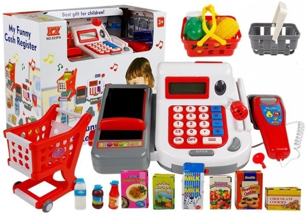 Dětská barevná pokladna s nákupním vozíkem a potravinami potěší všechny malé prodavačky. Dítě může produkty, které jsou přiložené v sadě skenovat a slyšet zvukové a světelné efekty. Stačí přiblížit skener k čárovému kódu a uslyšíte pípnutí. Pokladna má funkci kalkulačky. Pokladna je napájena dvěma bateriemi AA, které nejsou součástí balení. Hračka je vhodná pro děti od 3 let. Obsah balení: Pokladn...