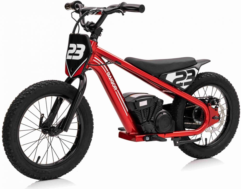 Dětská elektrická motorka/kolo BAIGOR 23 PRO přijíždí na nafukovacích kolech, která jsou tichá a při jízdě neruší. Dítě se posadí do pohodlně tvarované sedačky z eko kůže, její nosnost je 60 kg. BAIGOR 23 PRO má zadní kotoučovou brzdu, řetězový pohon a dosahuje rychlostí až 25 km/h. Balení obsahuje baterii i nabíječku.