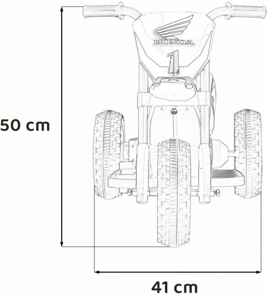 Po zapnutí se ozve zvuk motoru a po stisknutí plynového pedálu se motorka rozjede. Velká kola s terénním dezénem zajišťují stabilitu při jízdě venku a tvarované sedadlo zaručuje pohodlí a bezpečnost pro nejmenší uživatele. Ocelové nápravy kol se starají o stabilitu a odolnost vozidla. Součástí balení je také klakson, díky kterému je hra ještě zábavnější.