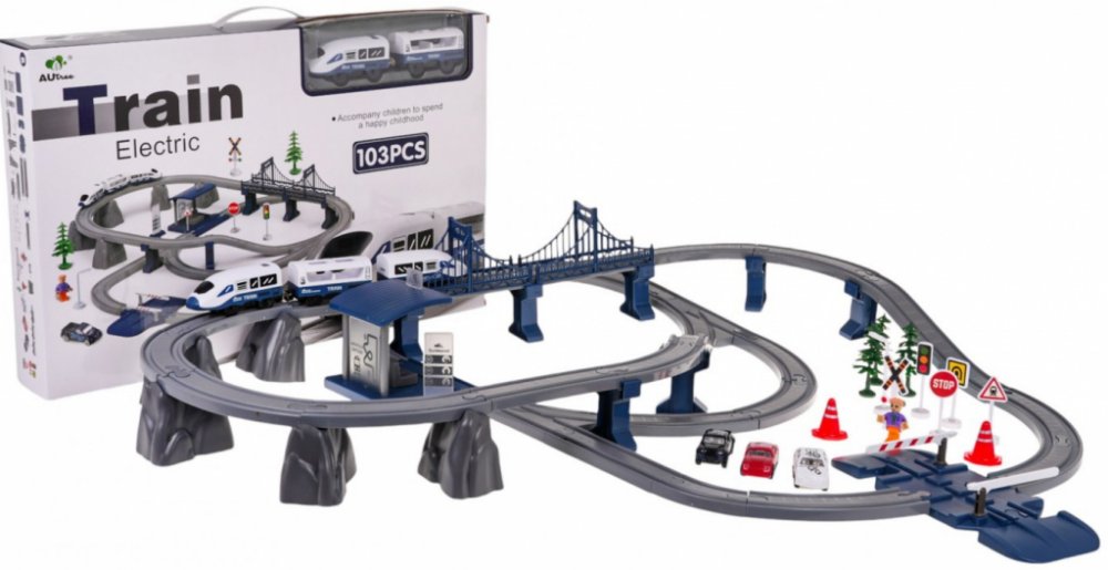 Dobře vybavená sada kolejí, vláčků a příslušenství pro děti od 3 let. Sada je vyrobena z nejkvalitnějšího plastu a je robustní a odolná. Obsahuje až 103 prvků: Stavební prvky dvoupatrové koleje, vláček, nádraží se zvukovými a světelnými efekty, most, závoru, dopravní značky, autíčka a figurku chlapce.