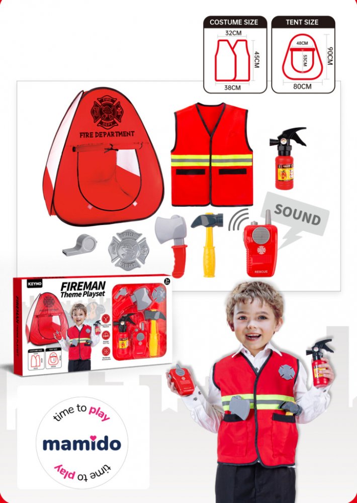 Součástí balení je červený stan Fire Department, hasičská vesta s reflexními prvky a řada realistických doplňků, jako je hasicí přístroj, vysílačka se zvukem, sekera, kladivo, píšťalka a odznak. Díky tomu mohou děti napodobovat akční situace a užít si dlouhé hodiny zábavy.