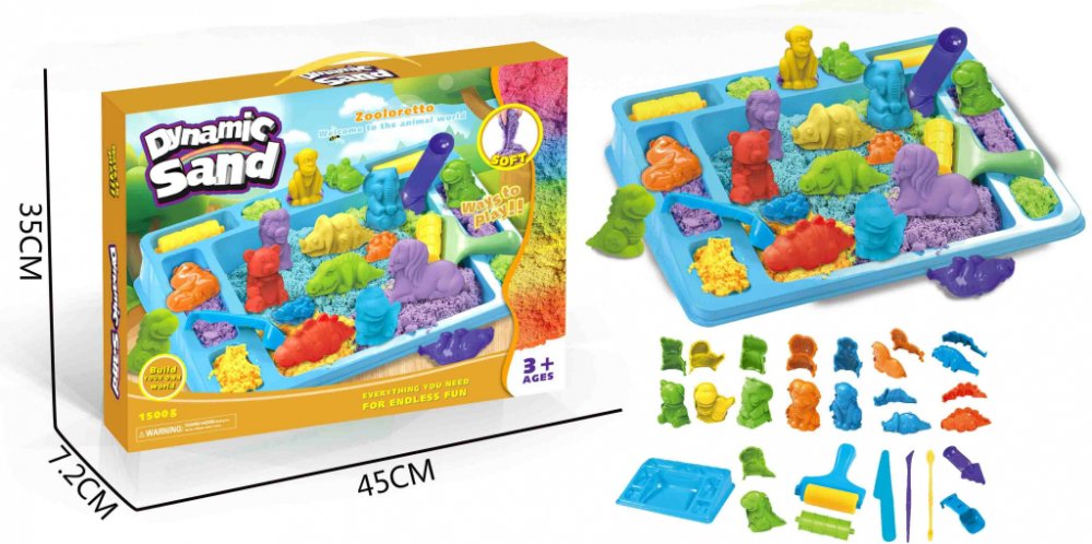Tato bohatá sada obsahuje barevný písek, díky kterému si děti mohou vytvořit vlastní zoo plnou zvířat. Písek je příjemný na dotek, měkký a skvěle drží tvar – ideální pro modelování a tvoření. Součástí balení jsou různé formičky zvířat, nástroje a tác, takže děti mohou tvořit podle vlastní fantazie a procvičovat jemnou motoriku i tvořivost.