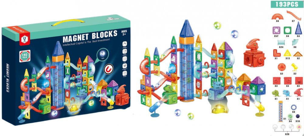 Obsah balení: magnetické bloky, průhledné dráhy, kulaté míčky, speciální doplňky (včetně světelného prvku)